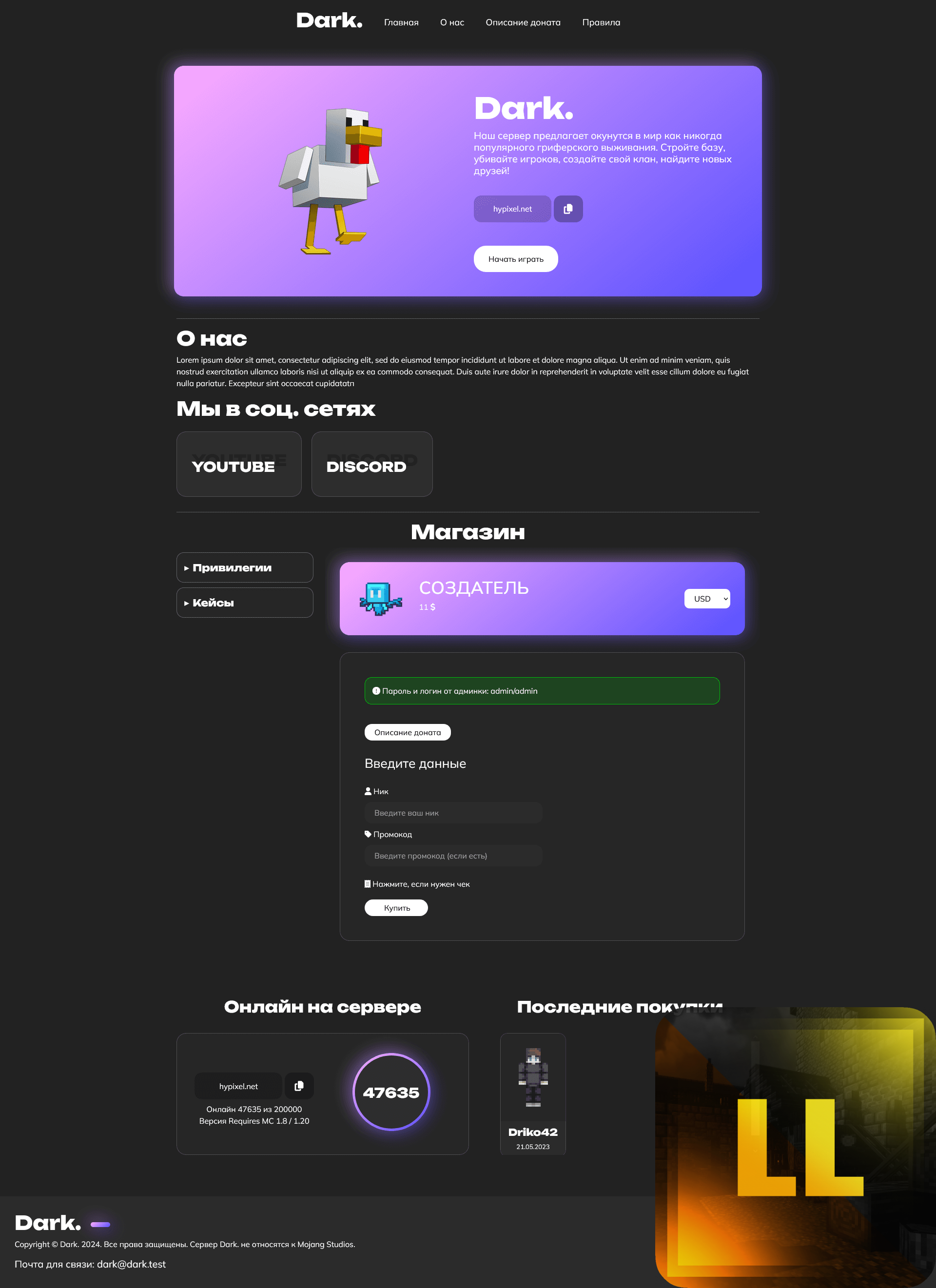 Сайт автодоната "Dark" - это скрипт для покупки игровых привилегий для Minecraft серверов. Прост в установке, поддерживает 6 платежных систем и полностью безопасен.