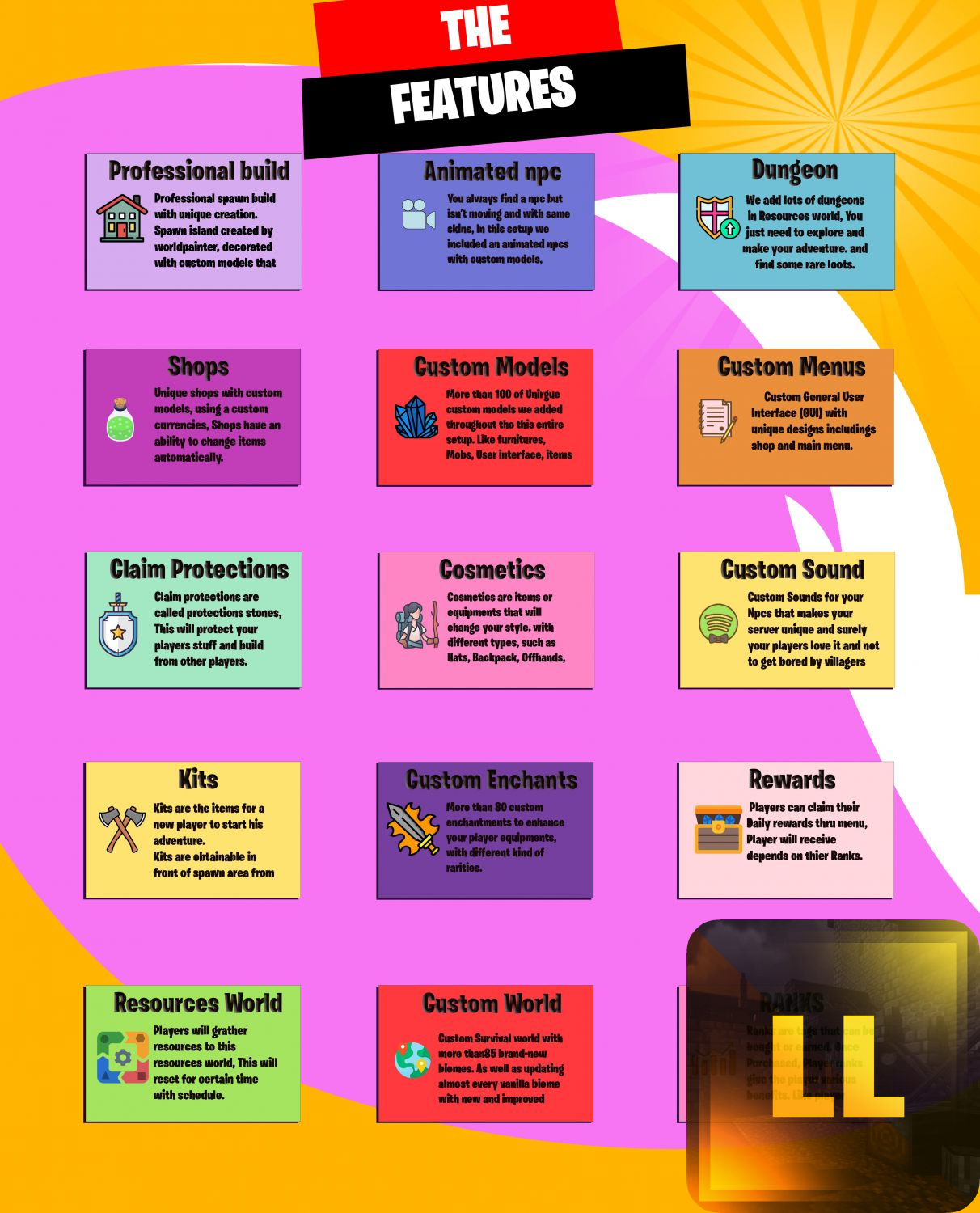 | ПРОФЕССИОНАЛЬНАЯ СБОРКА Профессиональная сборка с уникальным созданием. Остров спавна, созданный worldpainter, украшенный пользовательскими моделями, которые подходят для ролевых квестов, выживания и MMORPG. | АНИМИРОВАННЫЙ NPC Вы всегда найдете NPC, но он не движется и с теми же скинами. В эту настройку мы включили анимированных NPC с пользовательскими моделями, диалогами, значками. чтобы сделать ваш сервер живым. | ПОДЗЕМЕЛЬЕ Мы добавили множество подземелий в мир ресурсов. Вам просто нужно исследовать и создавать для игроков приключения, а также находить редкие трофеи. |