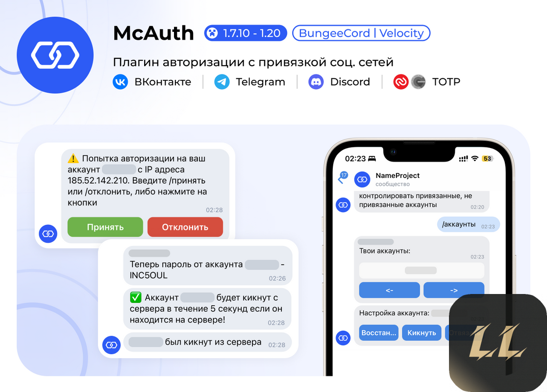 mcAuth bungee и velocity | Привязка аккаунта к VK, Telegram, Discord и TOTP