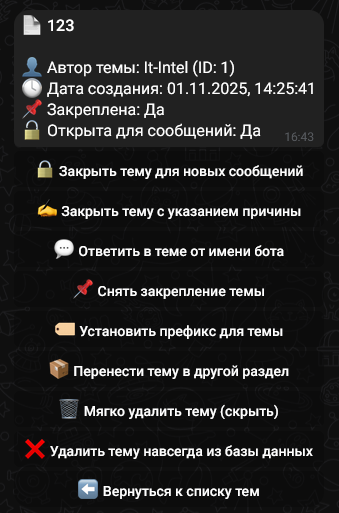 Бот предоставляет возможность работы с темами на форуме и пользователями.